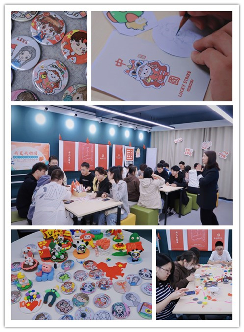 以青春之名迎接二十大,在徽章上书写青春誓言。活动分为美育教学与艺术体验两个版块,首先由专业美术机构付小雨老师为师生现场讲解美术绘画中构图、配色等相关知识和黏土造型处理中的揉、搓、粘等技巧等并进行示范创作;在辅助参与者实践操作,进行艺术体验的环节中,现场气氛轻松热烈。参与师生兴致盎然,专心致志地投入到爱国主题的徽章制作和创意黏土的绘画和制作过程中,获得真切充实的审美体验。同学们用画笔在在自己徽章上写下深情寄语,为祖国献上最美的祝福;用黏土捏出一颗颗爱国心,捏出了爱国爱党情怀,促进学生全面成长、塑造美好心灵。