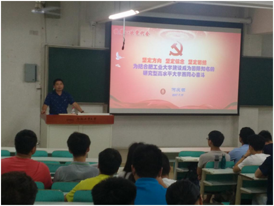 本次大会,学院党委副书记、副院长何庆领重点向学生阐述了学校发展面临的机遇与挑战,学校发展的奋斗目标、发展战略和主要任务,详细解读了“三步走”战略、“六个着力”主要任务和“六个大力”保障措施。何庆领结合学院学生工作实际和自身成长经历,对于如何领会校第八次党代会精神、如何理解马克思主义和价值观、如何提升党员素质和修养等问题一一进行了分析。他希望广大党员学生要从小事做起,提高自身党员素质,不断加强理论学习和实践锻炼。除此之外,他还结合我院实际向学生党员们介绍了我院目前在科技创新方面所获成绩,在优化师资队伍方面所获成果,在办学条件方面所获提高,对我院未来的发展充满信心。