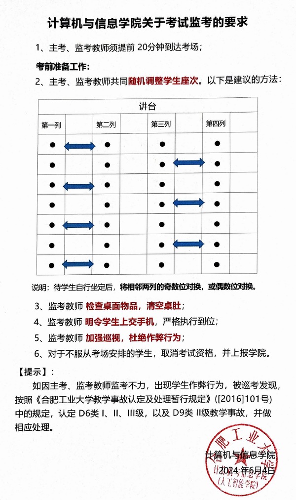 为进一步严肃考风考纪,增强当代大学生的诚信意识,营造风清气正的考试风气,学院根据《bwin必赢线路检测考试管理细则》和《bwin必赢线路检测学生违纪处分办法》对考试“监考”做出以下要求。同时,将组织学院教学指导委员会全体委员开展考试巡考督查(长期)。