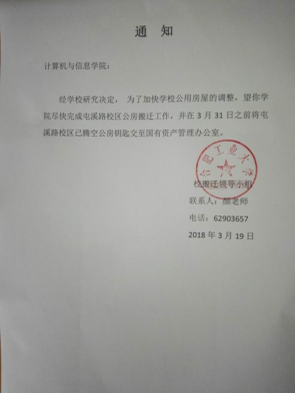 学院接学校搬迁领导小组通知,要求我院于本月底前将屯溪路校区学院公房钥匙交至校国有资产管理办公室。现通知如下:学院各科研团队请于3月28日(下周三)之前将原屯溪路校区公房钥匙交至院办徐静老师处,逾期不交学院将上报学校、追究相关当事人责任并给予相应处理。