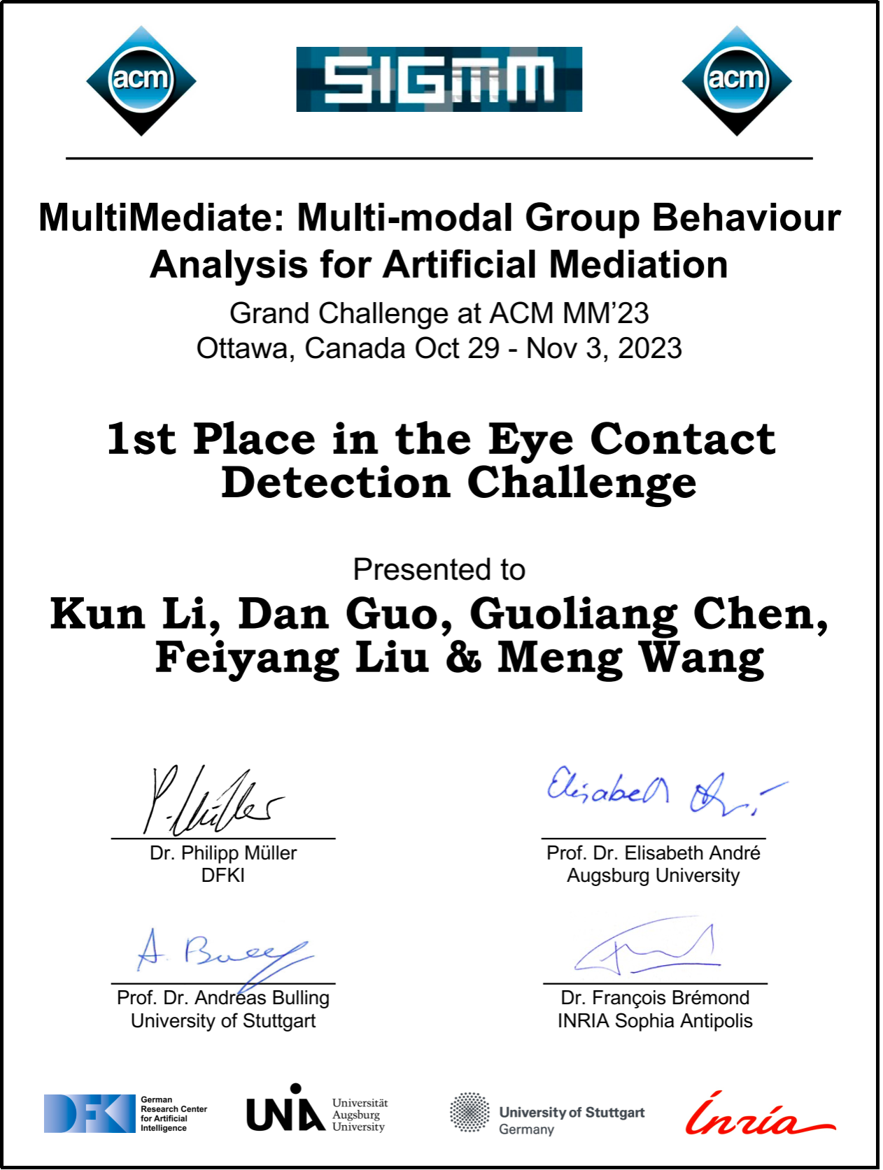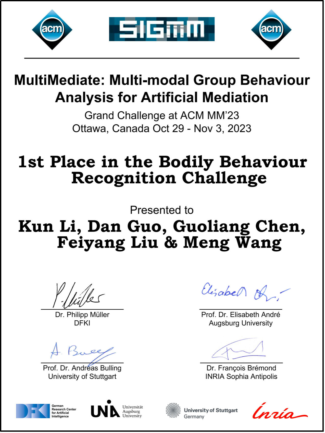 ACM国际多媒体会议(ACM Multimedia 2023)于2023年10月29日在加拿大渥太华举办,ACM国际多媒体会议是中国计算机学会(CCF)认证和多媒体研究领域评级中唯一的A类国际顶级会议。该会议针对多媒体领域的情感计算、群体行为分析等方向的研究热点,举办了系列挑战赛。76net必赢线路检测中心师生的师生组队参赛,斩获多模态情感分析挑战赛和多模态群体行为分析挑战赛的四项冠军,不同赛道的具体情况如下: