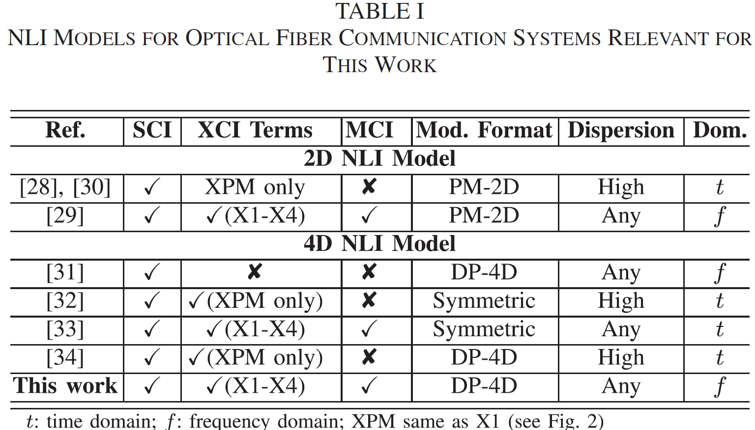 该论文针对大容量光通信中克尔非线性效应难以精准快速计算的问题,从微扰理论求解非线性薛定谔方程出发,提出了更加普适性的非线性串扰解析模型。与现有非线性串扰模型相比,该论文提出的非线性串扰模型不仅适用于任意双偏振四维调制格式,同时考虑了非线性信道中所有主要非线性串扰项,如图1所示。