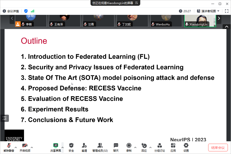 应我院计算机科学与技术系李萌副研究员的邀请,2024年1月12日上午10点,圭尔夫大学的XiaodongLin教授在线上为我院师生做了题为“RECESS Vaccine for Federated Learning: Proactive Defense Against Model Poisoning Attacks”的学术报告。李萌老师主持了本次报告会,学院相关研究方向的老师和学生参加了报告会。