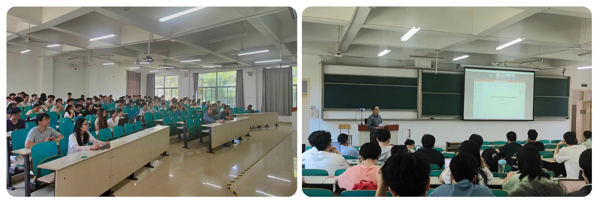 汪教授向在场的学生详细介绍了高维数据处理算法和交互可视分析方法的思路及其发展历程。他的讲解不仅涵盖了理论知识,更通过实例展示了这些方法在实际应用中的强大功能和显著效果。讲座内容丰富,深入浅出,让学生们对高维数据可视化有了更为深刻的理解和认识。