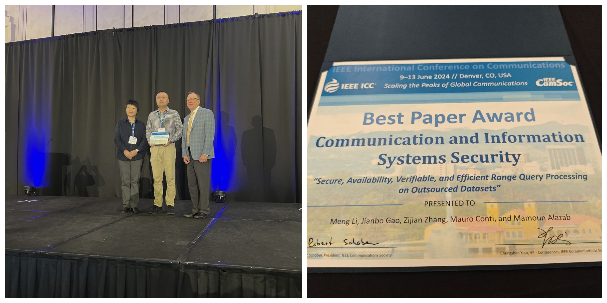 近日,通信领域旗舰会议IEEE International Conference on Communications (IEEE ICC) 2024在美国召开,我院副研究员李萌课题组的研究成果“Secure, Availability, Verifiable, and Efficient Range Query Processing on Outsourced Datasets”在众多论文中脱颖而出,获得了本次大会最佳论文奖,这也是本次大会通信和信息系统安全分会唯一获奖论文。第二作者是我院2023届硕士毕业生高剑博,当前正于北京理工大学网络空间安全学院继续攻读博士学位。该论文聚焦于安全范围查询的结果可验证问题。范围查询允许数据用户将其数据外包给云服务器,该服务器响应提交具有范围条件的请求的数据用户。然而,安全问题阻碍了其广泛运用。现有的工作忽视查询项目的可用性,未能提供安全验证保护或为了效率而牺牲搜索准确性。该研究提出安全、可用、可验证和高效范围查询方案(SAVE),具有三个显著的特点:针对恶意云服务器的安全可用性检查,设计了一个基于密钥索引和安全验证机制来检查匹配节点可用性的方案,包括有效性和新鲜度检验;为查询结果的正确性和完整性,在不影响安全性的条件下设计了一种有针对性的验证机制;设计了一种分层编码方法来提高搜索效率和准确性。该研究形式化地陈述并证明了SAVE在随机预言机模型中的安全性,并在多个数据集上进行了广泛的实验来验证效率。