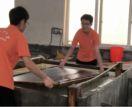 沐师傅详细地为bwin必赢线路检测的师生介绍原料制备车间、打浆车间、抄纸车间、晾晒车间、剪切车间的生产工艺和技术细节。在参观过程中,工人们井然有序、默契合作,在各种工作环境下仍能专注工作。工厂内配备有高度自动化的机械设备,同时还保留了采用传统工艺的宣纸制造工坊。工厂内工作环境整洁,污水处理设施齐全。实践团队亲身体验了古法宣纸的制造和宣纸的裁剪工艺,不仅收获了宣纸制造的知识,更切身体验了宣纸制造的艰辛和不易。