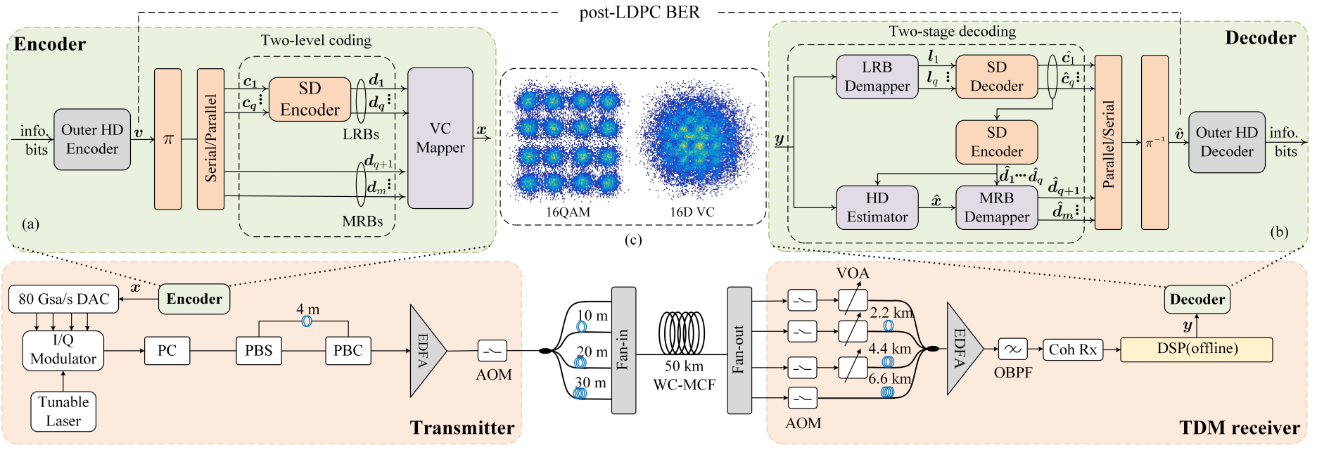 我院师生本次获得的高分论文“Experimental Demonstration of 16D Voronoi Constellation with Two-Level Coding over 50km four-Core Fiber”,针对未来基于多芯光纤技术的扩容优势和挑战,提出了一种基于16维联合编码调制(MLC-16DVC)的多芯光纤传输方法(如图1所示)。经过单跨50公里四芯光纤传输实验验证(传输实验系统如图2所示),相较于传统的二维独立QAM调制,所提出方法可以容忍更大的芯间信噪比差异影响,并在外级联硬判决纠错容限处可提供6dB的光功率增益(如图3所示)。
