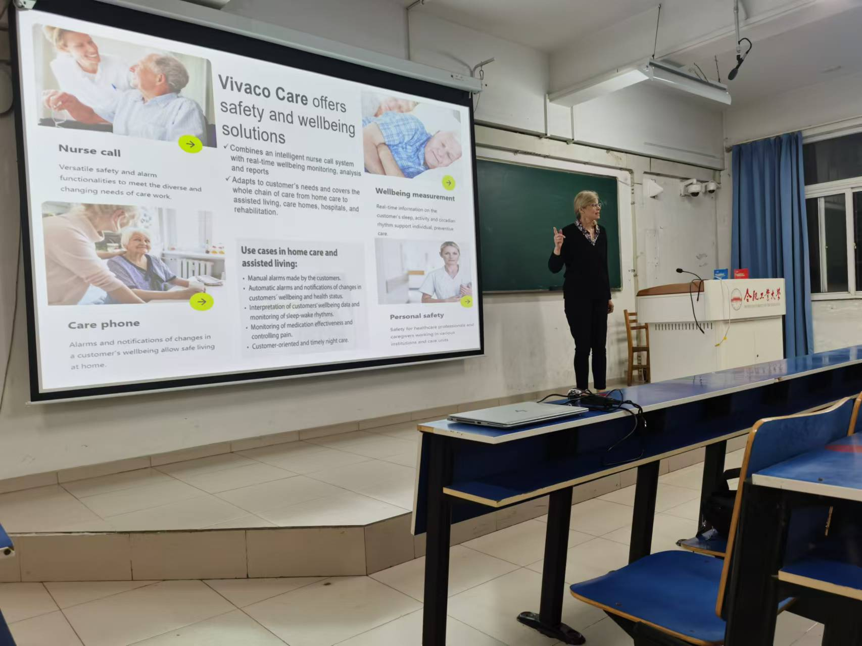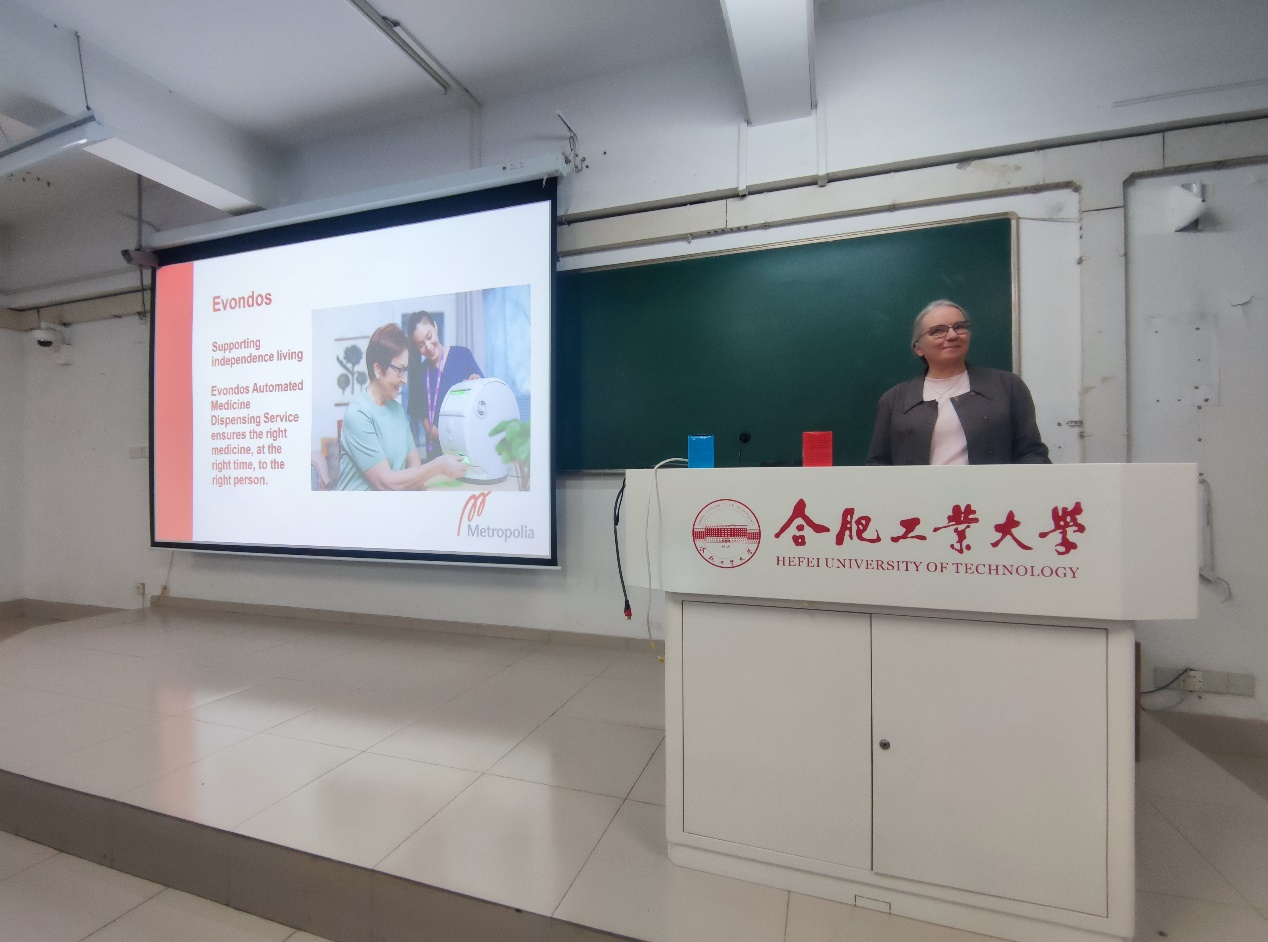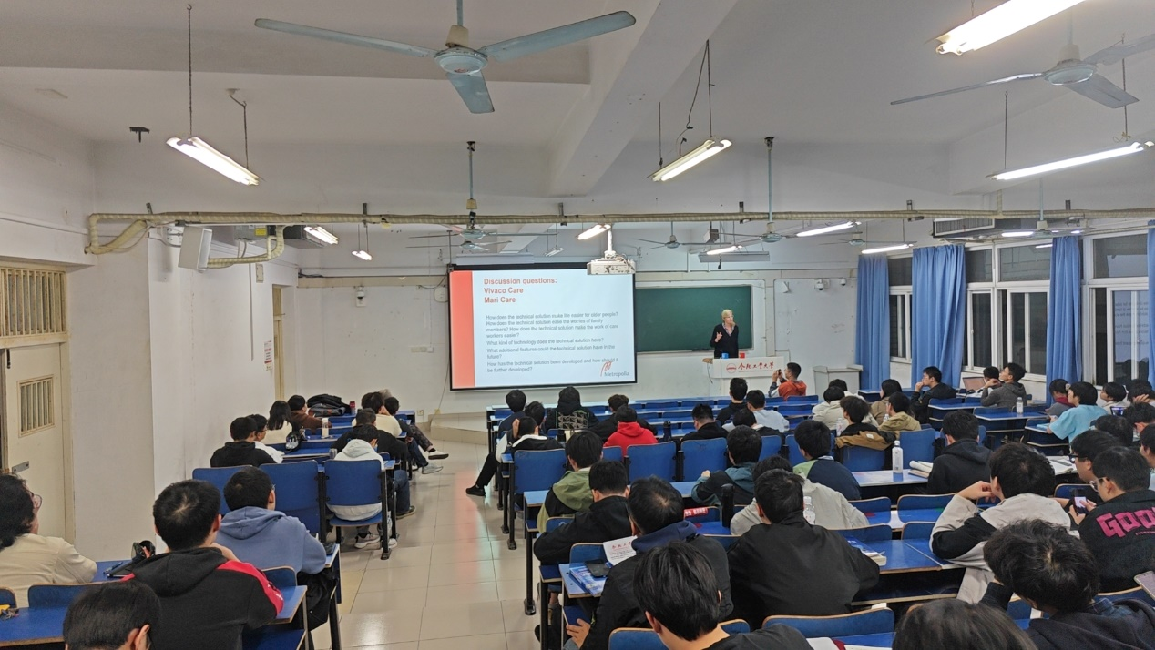 课上,Päivi Haho博士介绍了Evondos自动化药物分发系统和Suvanto Care远程安全监测系统,展示了现代智能养老技术在保障老年人用药安全和居家护理方面的应用成效;Pirjo Vesa博士则讲解了Vivaco Care智能护理系统和MariCare智能检测系统,这些技术可以实现行为监测、跌倒预防和安全报警,有效提升养老服务的质量。两位教授还通过实际案例,介绍了智能机器人、健康监测传感器和非穿戴式检测系统等技术。课上,同学们与两位教授就Evondos系统的使用感受以及智慧养老领域的技术发展进行了讨论。
