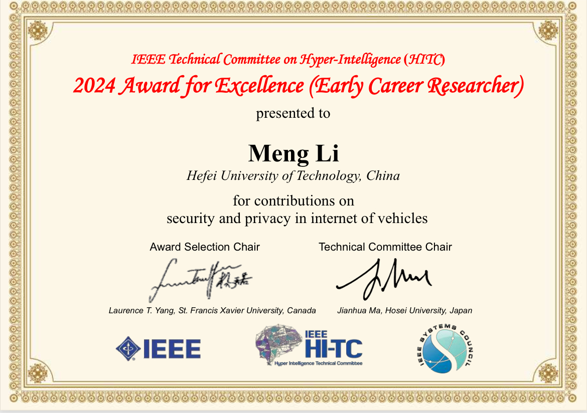 该奖由IEEE HITC于2022年设立,专门表彰获得博士学位后五年内在学术上做出突出贡献并具有长远发展潜力的青年学者。每届提名人数众多,竞争异常激烈。专委会最终从全球遴选出5-6名在职业生涯早期做出了突出贡献的计算机领域青年科学家。李萌副研究员因在车联网安全和隐私领域做出的突出研究工作而获奖。此次获奖,既是国际同行对他研究成果水平和学术贡献的肯定,同时也是对bwin必赢线路检测(“泛在隐私实验室UbiP Lab”)近五年来在网络空间安全领域取得高水平成果的认可。