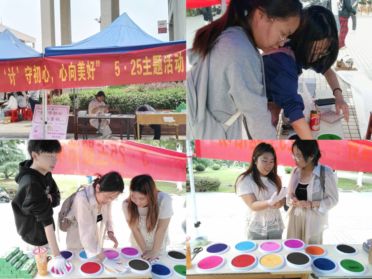 5月24日中午在一食堂下沉广场开展线下游园会活动。活动现场布置了空白“初心画布”,同学们用颜料在手掌上勾勒出独特的色彩,随后将手印按在画布上,一个个色彩斑斓的手印相映成趣。手印过程中,大家相互交流创作灵感,分享近期学习生活中的感悟,不仅拉近了彼此距离,更打破了社交壁垒,为后续心理健康互助奠定了良好基础。此外,活动现场还设置“沙包掷准”环节,同学们可以通过投掷沙包击中靶盘,来获得相应的小奖品。在一次次瞄准与抛掷中,大家内心的压力也一同释放。