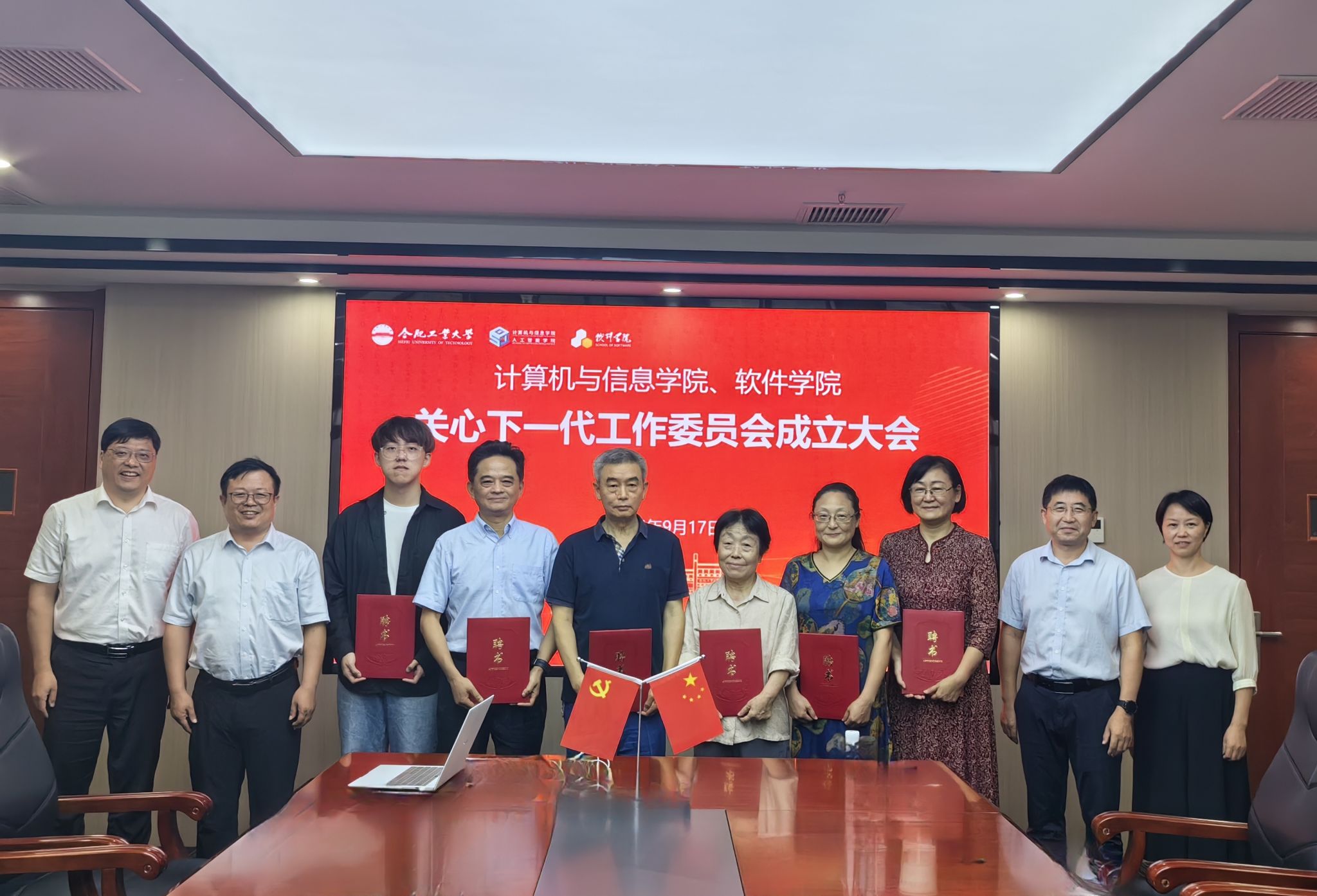 9月17日,76net必赢线路检测中心(人工智能学院)、软件学院关心下一代工作委员会成立暨委员聘任仪式在A1106举行,学院领导年永琪、张海林、储文静等出席仪式。会议由学院正处级组织员何庆领主持。