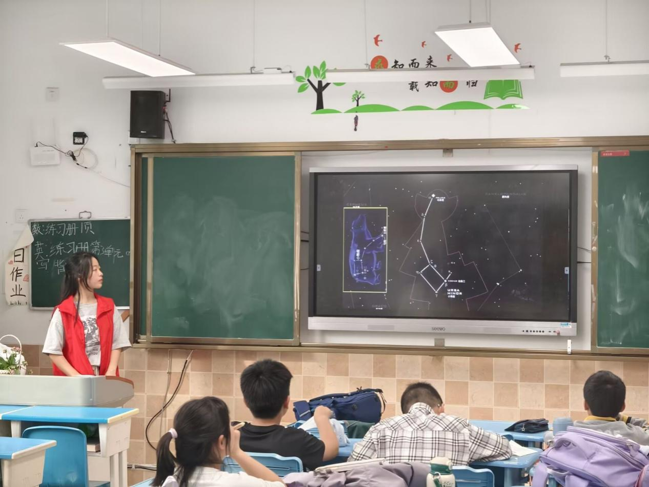 活动伊始,志愿者以“星空的秘密”为切入点,通过趣味互动问答引发同学们的好奇心。活动中,志愿者巧用“星空拼图”“银河故事汇” 等生动比喻,通过星空图片展示等形式,引导大家在观察与思考中感受宇宙之美。 同学们踊跃举手、积极提问,现场氛围热烈。