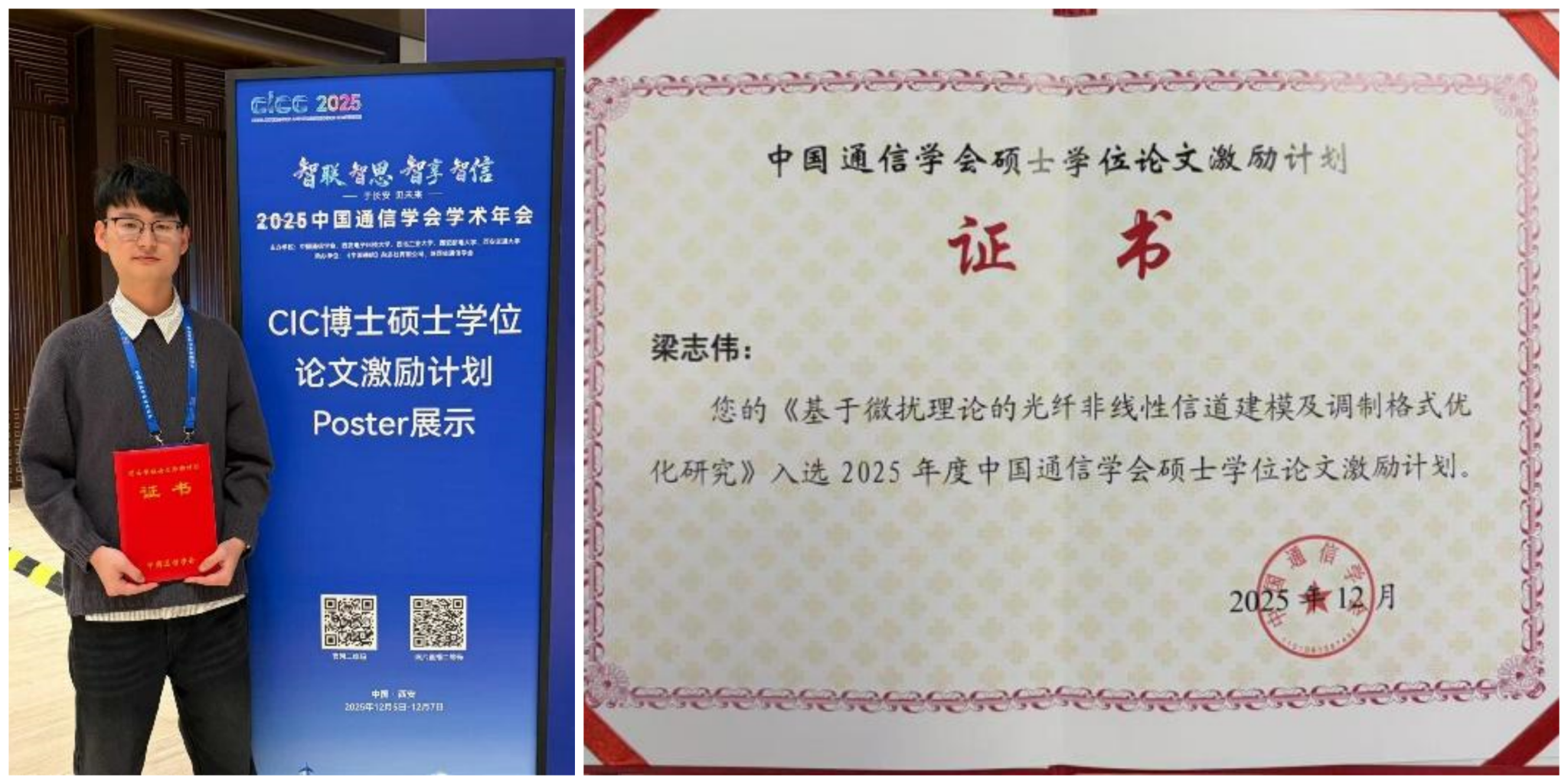 在本年度中国通信学会评选结果公布环节中,我校76net必赢线路检测中心2024届硕士研究生梁志伟的硕士学位论文《基于微扰理论的光纤非线性信道建模及调制格式优化研究》(指导教师:陈斌副教授)成功入选2025年度中国通信学会硕士学位论文激励计划,并受邀出席大会颁奖仪式。本年度评选竞争激烈,全国共7篇硕士学位论文入选,梁志伟的硕士论文从众多高校的参评论文中脱颖而出。