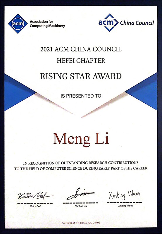 From July 28 to July 30, 2023, the 5th ACM China Turing Conference was held in Wuhan, Hubei Province. At the conference, the ACM China "Rising Star Award" and "Outstanding Doctoral Dissertation Award" were presented to recognize outstanding young researchers and outstanding recent doctoral graduates in the field of computer science. After individual applications and expert reviews, our faculty member, Professor Li Meng, won the 2021 ACM Hefei Branch "Rising Star Award", and Professor Zhao Shan won the 2021 Changsha Branch "Outstanding Doctoral Dissertation Award" and the 2021 ACM SIGWEB CHINA "Outstanding Doctoral Dissertation Award".