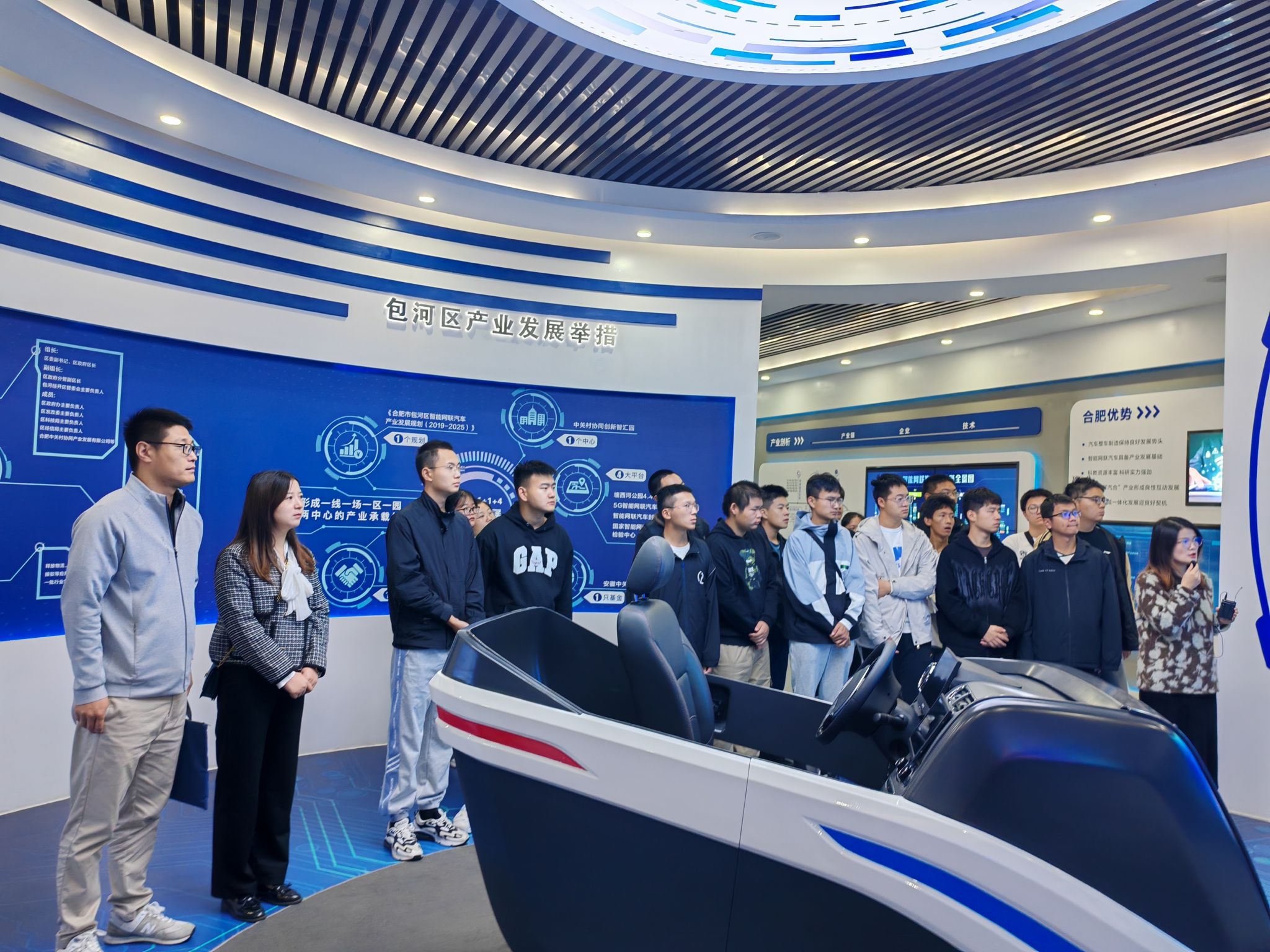 Under the guidance of the narrator, the students visited the sequence hall, autonomous vehicles, inspection and testing modules in turn, learning about the automotive industry department, cutting-edge technology, and understanding the key enterprises and development measures in Baohe District. The students walked and learned, interacting with the narrator from time to time. During the activity, the students also experienced the latest autonomous vehicles, feeling the charm that technology brings to life.