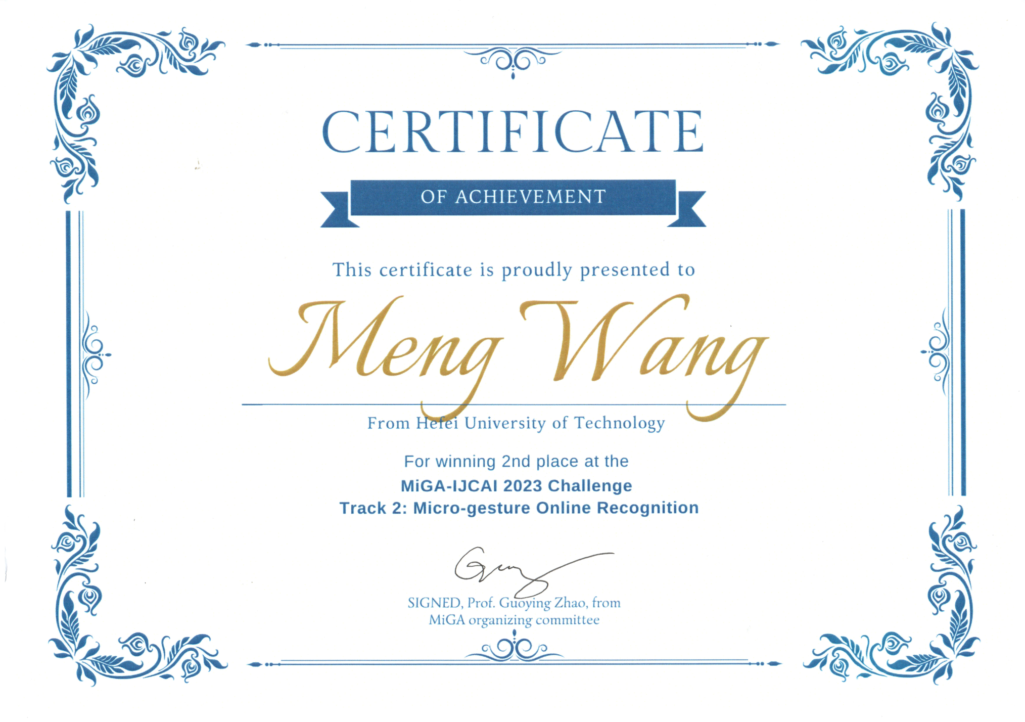 The 2023 International Joint Conference on Artificial Intelligence (IJCAI 2023) was held in Macau, China on August 19, 2023. The results of the 2023 Micro-gesture Analysis and Emotion Understanding Challenge (The 1st Workshop & Challenge on Micro-gesture Analysis for Hidden Emotion Understanding) were announced at the conference. The team of teachers and students from the Multimedia Computing Laboratory of Hefei University of Technology participated in this event for the first time and won the championship in the micro-gesture recognition track and the runner-up in the online micro-gesture detection.
