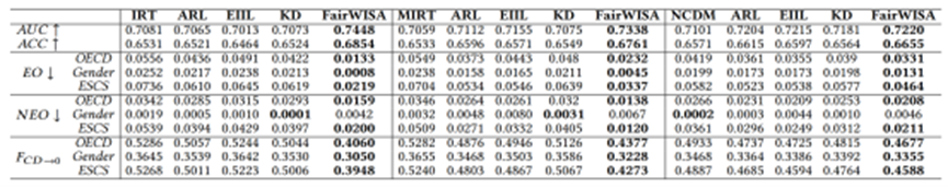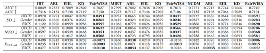 Table 2: Comparison of different approaches on PISA challenging test. OECD, Gender, and ESCS serve as sensitive attributes, dividing data samples into two groups for fairness evaluation. Bolding signifies the best performance among all methods