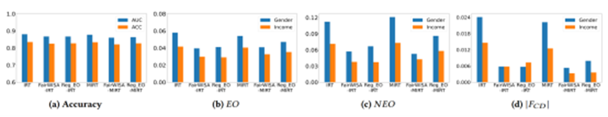 Figure 2: Comparision of Reg_EO and FairWISA. FairWISA-IRT (FairWISA-MIRT) and Reg_EO-IRT (Reg_EO-MIRT) denote FairWISA and Reg_EO methods implemented with IRT and MIRT as backbones, respectively. Plot (a) shows the performance in terms of accuracy, while Plots (b), (c), and (d) show the performance in terms of fairness